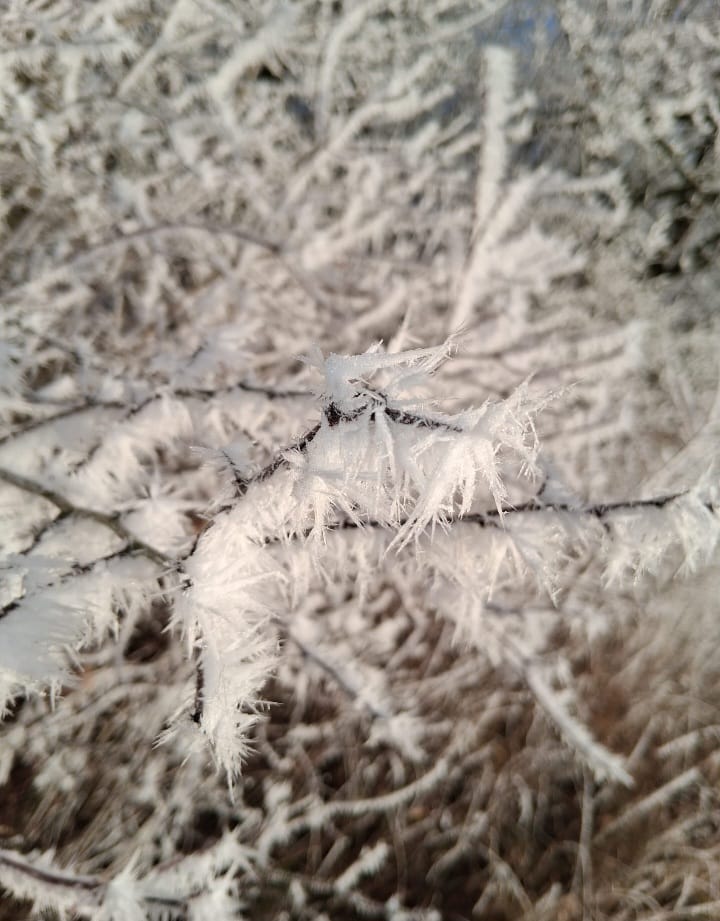 deren Äste von einer dicken Schicht Raureif überzogen waren.
